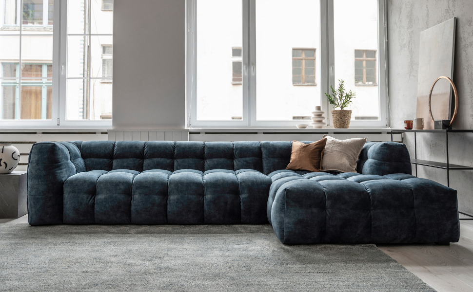 - w jasnym, raczej minimalistycznym salonie w jasnej tonacji królową zostanie sofa narożna Umo Nononobo, która intryguje welwetem w kolorze ciemnego nieba;