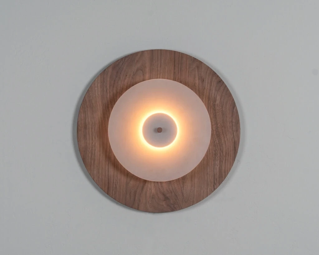 Lampa ścienna Aeroplan Wood o śr. 32 cm. Nowa odsłona bestsellerowego kinkietu Aeroplan to subtelne połączenie jednego okręgu z piaskowanego szkła z drewnem orzecha amerykańskiego. Całość doskonale wpisuje się w nowość marki Loftlight - kolekcję Wood&Glass.