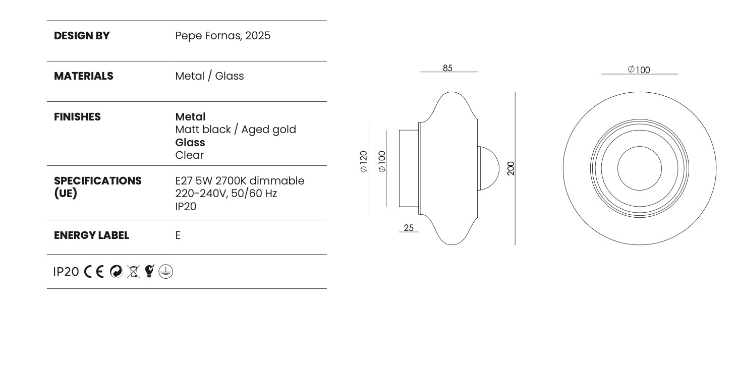 Parametry techniczne. Kolekcja wykorzystuje energooszczędną technologię LED – w zależności od modelu 12W lub 28W – oraz żarówkę E27 w kinkiecie. Zakres strumienia świetlnego wynosi od 1 000 do 2 000 lm przy temperaturze barwowej 2700K. Wszystkie wersje są ściemnialne (lampy stołowe i podłogowe wyposażono dodatkowo w sterowanie dotykowe), co pozwala dopasować natężenie światła do pożądanego nastroju. Klasa energetyczna F – zgodna z aktualnymi wymogami europejskiego oznakowania. Zasilanie: 220–240V, 50/60 Hz.